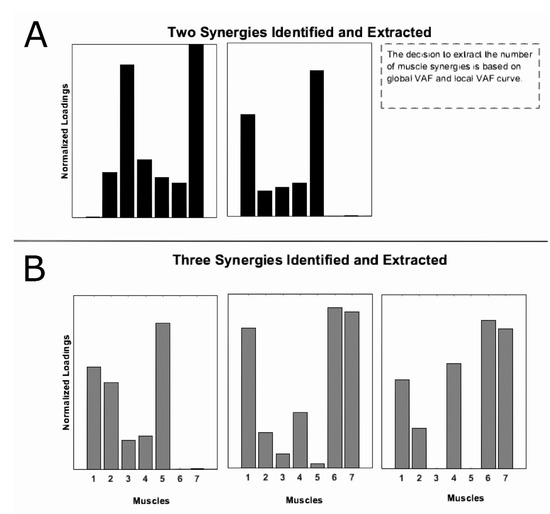 (A) Two synergies (task 2) shown against (B) three synergies (task 1) for a sample EMG data of seven muscles.