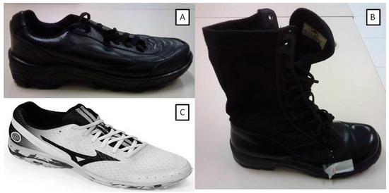 Military sports shoe (A), combat boot (B), and running shoe (C).