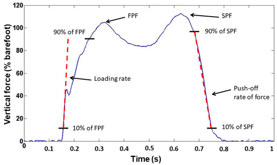 Heel strike and toe-off were detected using a 20 N threshold [24] in order to determine stance phases (i.e., contact time) for each foot. After that, first and second peaks were determined from the vertical component of the ground reaction force waveforms for each foot. The slope of 10–90% of first peak force was used to calculate instantaneous loading rate (after heel strike) in order to assess rate of loading (i.e., transfer of force between the ground and the feet). The slope of 90–10% of the second peak force enabled us to calculate push-off rate (i.e., rate of unloading, before toe-off, Figure 2), which allowed us to assess the rate of unloading (i.e., transfer of force between the feet and the ground). Force data were time-normalised to 100 samples using heel strike and toe-off to enable temporal statistical analysis of data. All data processing was conducted using custom made scripts (Matlab, MathWorks Inc, Massachusetts, MA, USA).