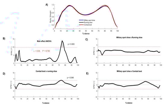 (A) Average vertical GRF data. (B) ANOVA footwear main effect trajectory. The horizontal dotted lines indicate the critical random field theory threshold of p < 0.05. As the SPM F* line crossed the dotted line above, a statistical difference was found. (C) t-test comparison between military shoe vs. sports shoe. (D) t-test comparison between combat boot shoe vs. running shoe. (E) t-test comparison between military shoe vs. combat boot.
