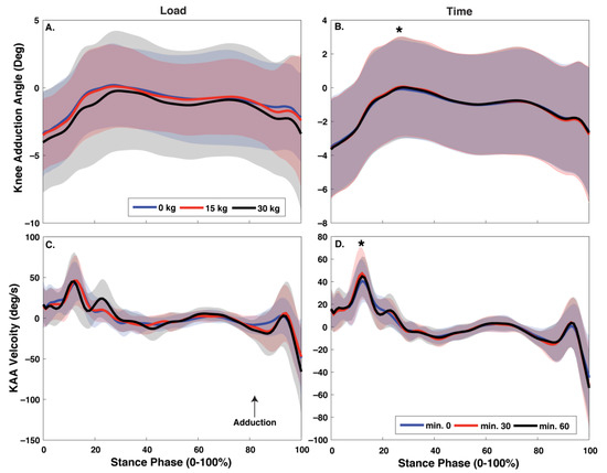 Mean ± SD stance phase (0–100%) for knee adduction angle (A,C) and velocity (B,D) with each body borne load (0 kg, 15 kg, and 30 kg) and time point (minute 0, 30, and 60). Time had a significant effect on magnitude and maximum velocity for KAA (p < 0.05 indicated with *).