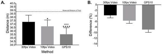 Comparison of differences between the known distance and that reported by the three methods using one-way ANOVA provided a significant overall difference (F(2,87) = 27.9, p < 0.0001, Figure 2A), with post-hoc (Tukey’s Test) differences between 30 fps vs. 10 fps video tracking (p = 0.025), 30 fps video tracking vs. 10 Hz GPS (p < 0.0001), and 10 fps video vs. 10 Hz GPS (p < 0.0001). Error interval data analysis using Bland–Altman confirmed 10 fps video provides consistently lower values than 30 fps (bias = 0.64 ± 0.38, 95% LOA −0.10–1.38 m, Figure 3A) while 10 fps video provides greater values than 10 Hz GPS (bias = 1.14 ± 0.88, 95% LOA −0.57–2.86 m, Figure 3B). Percentage difference for both comparisons are shown in Figure 3C,D.