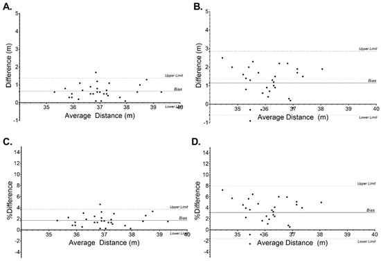 Error Interval comparison, Bland–Altman Bias with 95% Limits of agreement of two measurements for a dry-land canoe slalom track of known distance. (A). Difference (m) between 30 fps–10 fps automated video tracking, (B). Difference (m) between 10 fps automated video tracking and 10 Hz GPS, (C). Percentage difference between 30 fps–10 fps automated video tracking, and (D). Percentage difference between 10 fps automated video tracking and 10 Hz GPS.