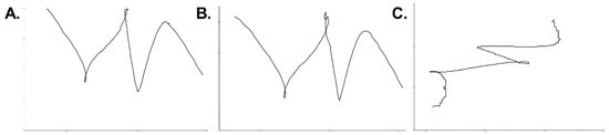 As per the dryland trial, there was a relatively low level of data set errors for GPS where on-water trials produced 10% (three definite) data set errors with more yawing (side-side) motion in the path (Figure 6) as might be expected in a human propelled kayak. Rotation of the upper body caused by the forwards reach of each stroke would result in directional heading changes within the GPS device. This yawing path might be expected to increase overall distance rather than reduce it compared to the smoother line of the on-water manual tracking (Figure 6A) and in the case of the dryland trial automated aerial tracking (Figure 4A,B). However, linearity of relatively low sampling frequency along with possible impediment of satellite reception brought about by head movements typical within slalom, combined with positional dropout are likely causes of inaccuracies.