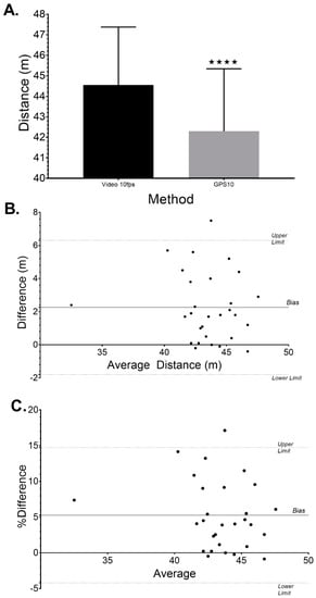 Comparison of 10 fps manual video tracking with 10 Hz GPS during the on-water slalom trial, where (A). Shows the Mean ± SD distance, (B). Error interval (Bland–Altman) for the distance (m), and (C). Error interval for percentage difference. where ★★★★ equals p < 0.0001 when compared to 10 fps video.