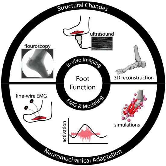 For researchers aiming to illuminate the mechanisms of altered foot function and their influence on mobility outcomes (e.g., gait mechanics, whole-body metabolic energy cost, balance control) in older adults, a major obstacle is unraveling the concurrent alterations in tissue morphology, structural properties and neuromechanical functions. Structurally, older adults have smaller and weaker intrinsic foot muscles and a more dissipative fat pad [18], which could potentially alter foot energetics during locomotion. Moreover, there are numerous skeletal deformities in older adults that affect joint mobility [18] (e.g., hallux valgus/rigidus and flattening of the longitudinal arch) that we speculate could alter the foot’s ability to regulate stiffness and, hence, the lever function. There are also purported changes in connective tissue architecture with aging, such as the altered insertion sites of the Achilles tendon on the calcaneus [19]—which we speculate could potentially disrupt the mechanical energy transfer between the foot and the ankle. Neuromechanically, it is likely that these structural changes, combined with decreased sensory feedback [20] and altered plantar pressure distribution [9] with aging, could alter intrinsic foot muscle activations. Yet, there is currently little knowledge of the neuromechanics of the intrinsic foot muscles in older adults and how foot muscle activations affect overall mobility outcomes. In the presence of numerous structural and functional alterations, interpreting age-related changes in foot mechanics and energetics will be undoubtedly complex. We believe that these challenges are best met through collaborative efforts among researchers to leverage emerging tools and techniques to examine the independent and interdependent effects of structural changes (e.g., via non-invasive imaging) and neuromechanical adaptations (e.g., integrative modeling and experimental approaches) (Figure 1).
