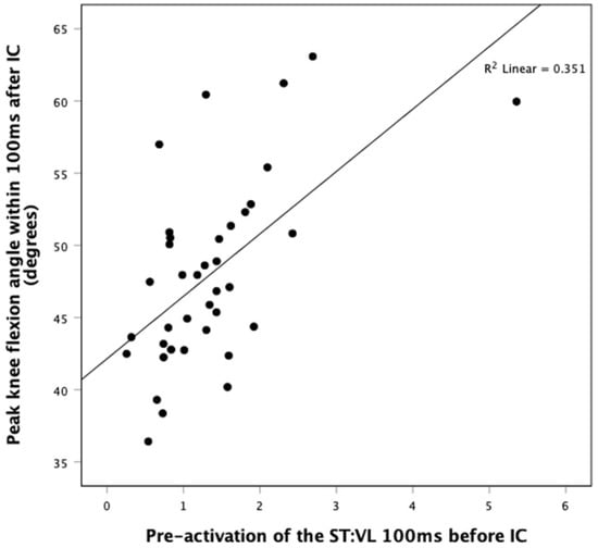 Relationship between peak knee flexion angle and pre-activation ratio of the semitendinosus to vastus lateralis.
