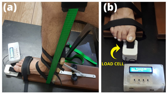The force of the muscles that control the medial longitudinal arch of the foot was measured with a load cell linked with an Arduino (an open-source electronic prototyping platform) for the signal acquisition of force in kilograms. We used a custom-made foot strength measurement, a wooden platform with a setup to stabilize the ankle–foot complex, as seen in Figure 1, according to the device used by Quek et al. (2015) [30], who verified excellent intra-rater reliability (ICC = 0.982, CI = 0.96–0.99).