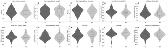 Boxplots and histograms of the variables: (A) Foot Posture Index (FPI-6); (B) normalized foot length; (C) normalized foot strength; (D) foot arch height—WB; (E) midfoot width—WB; (F) foot arch height—NWB; (G) midfoot width—NWB; (H) DiffFAH; (I) DiffMFW; and (J) general foot mobility. The violin plots show the data distribution, and the boxplots present the data locality, spread and skewness of dominant (black) and non-dominant (gray) feet.