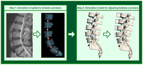 The load distribution of the spinal structures can then be precisely quantified with patient-specific simulation models. Furthermore, due to the fast and efficient lordosis curvature adaption in the simulation directly, the biomechanical research can benefit from our proposed method in any study that includes the generation of new spinal models. For instance, our approach can be applied in investigating the alternation of the aging lumbar lordosis [30,31] and the consecutive postural changes, which requires implementing multiple patient-specific models for analysis. Additionally, by using our proposed method, researchers can run exhaustive experiments, which may include the generation of new spinal models, thus providing new insights into the mechanism of structural compensations in the spine and throughout the entire body.