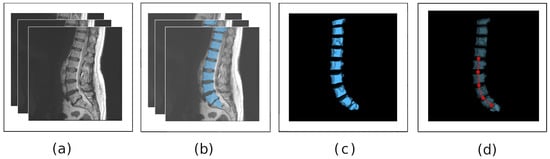 To train the neural network, we built the training dataset by using publicly available and annotated MR images of the lower spine from different sources. The MyoSegmenTum dataset provided by Burian et al. [13] contains 54 T2*-weighted MRI scans of manually segmented lumbar vertebral bodies (L1 to L5). The dataset released by Zukić et al. [14] includes 17 anonymized MR images of the lower spine (T11 to L5 vertebrae) with the corresponding segmentations. The dataset proposed by Chu et. al. [15] consists of T2-weighted MR spine images of 23 patients, where each image contains at least seven vertebral bodies of the T11–L5 region. Furthermore, we added a custom dataset with MRIs of L5–T10 vertebrae to the training database. Each scan with the volume size around px and image spacing mm contained eight vertebrae from L5 to T10, which we manually segmented and verified through medical experts.
