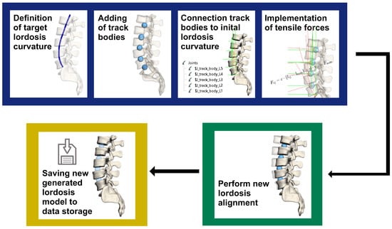 Pipeline of the adaption from the initial to the target lordosis. The blue box shows the preprocessing step of the data. This step includes the definition of the target lordosis curvature (marked as a blue curve), the adding of the track bodies (light blue spheres), the connection of the track bodies to the target lordosis curvature, and the implementation of the tensile forces. The next step of the pipeline is the performance of the new lordosis alignment presented in the green box. The transparent geometries belong to the initial model and the solid to the target model. The final pipeline step is the saving of the new generated lordosis model represented in the yellow box.