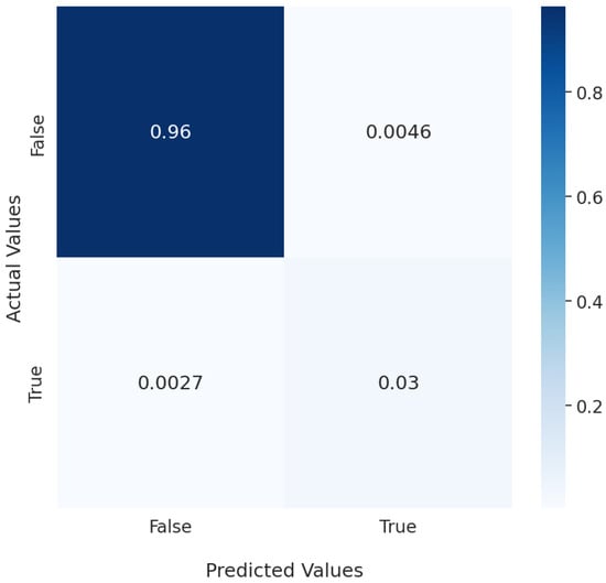 The confusion matrix in Figure 4 shows that the segmentation neural network performed well. The neural network recognized 96% of all segmentation data as true negatives, i.e., regions in the MRI with no vertebral bodies. Furthermore, 3% of the data were correctly predicted by the deep learning model as vertebral bodies. This significant disparity was caused by the high-class imbalance between the foreground, which resembled the lumbar vertebral bodies, and the background. Approximately 0.46% of the background was incorrectly associated with vertebral bodies, whereas 0.27% of vertebral bodies were not recognized as such.