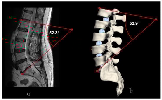 We performed the entire pipeline on three randomly selected patient-specific MRI scans of the lower spine. To determine the degree of lumbar lordosis curve, we used the Cobb angle [21,22], which is a scientifically accepted method from clinical practice. The Cobb angle defines the lumbar lordosis as the sagittal angle between the upper endplate of vertebra L1 and the endplate of the sacrum (Figure 5a). For the measurements, we applied the sagittal image of three different patients and the corresponding generated 3D lumbar spine models. The lordosis values for three selected spines are presented in Table 1.