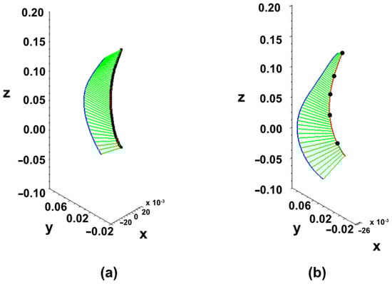 In terms of obtained results, we have shown that the proposed method can precisely reproduce patient-specific lordosis. It is generally accepted that the lower RMSE value indicates better method performance, where a perfect fit is given by the RMSE value of 0. By comparing the RMSE of the areas under the curve in the sagittal and coronal planes of the corresponding lumbar curvatures (Figure 7), we observed negligible deviations between the original and generated lordosis curves in the coronal (0.0001 m2) and sagittal (0.0012 m2) planes. The experimental results showed that the average Cobb angle in the medical data, which was annotated by experts, deviated by 0.2° from the average Cobb angle calculated in the target spinal model. Bassani et al. [28] confirmed that the global sagittal alignment, lumbar typology, and sacral inclination affect the intervertebral loads in the lumbar spine. In future studies, we will clarify to what extent a minor Cobb angle deviation, such as the one given in our method, can affect the spinal load distribution along different vertebral levels.