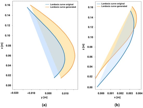 where is the AUC of the target lordosis curve generated in the simulation software, is the area under the original curve derived from medical data of the patient, and N is the number of test samples. This selected metric is commonly used in model evaluation, because it describes the error in units (or squared units) of the component of interest. For simplicity of calculation, we considered the approximated lordosis curves in two planes: sagittal and coronal. Therefore, we needed to determine two RMSE errors: one for the curve in sagittal and one in the coronal axis of the 3D lordosis curve. The results of the RMSE calculation (Table 2) showed a minor difference between the original and generated lordosis curvature areas of 0.0012 m2 in terms of AUC in the sagittal plane (Figure 7a), as well as 0.0001 m2 in the coronal plane (Figure 7b).