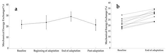 Changes in mechanical energy exchange. (a) Average of mechanical energy exchange across different periods of split-belt treadmill training. The error bars represent the standard deviation. (b) Mechanical energy exchange improved for all participants from the baseline to the end of adaptation periods.