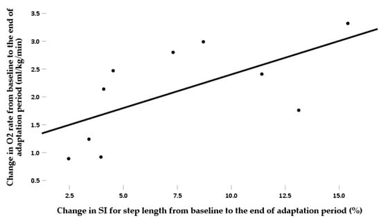 There was a significant effect of training period for O2 rate (p < 0.001) (Figure 4). Post hoc testing revealed that O2 rate significantly decreased from the baseline period (8.8 ± 2.0 mL/kg/min) to the end of adaptation period (6.7 ± 1.5 mL/kg/min) (p < 0.001). Additionally, O2 rate significantly decreased from the beginning of adaptation (8.7 ± 1.7 mL/kg/min) to the end of adaptation period (p < 0.001, Cohen’s d = 1.17), but significantly increased from the end of adaptation period to the post-adaptation period (8.9 ± 1.3 mL/kg/min) (p = 0.001, Cohen’s d = 1.52). Moreover, the decreasing SI for step length was significantly associated with the decreasing O2 rate from baseline to the end of adaptation period (rho = 0.732, p = 0.016) (Figure 5). However, there was no association between step length asymmetry and O2 rate at the end of adaptation period (rho = 0.467, p = 0.174).