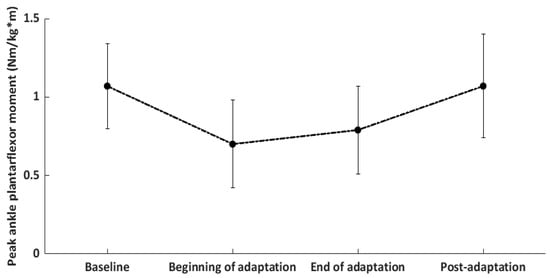 Changes in peak ankle plantarflexor moment during push off. Average peak ankle plantarflexor moment during push off across different periods of split-belt treadmill training. The error bars represent the standard deviation.