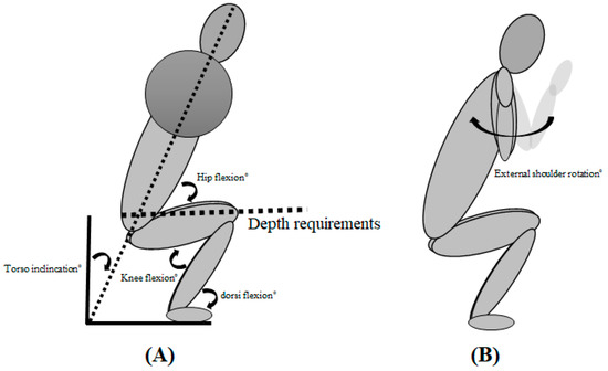 The participants in the current study consisted of 12 recreationally strength-trained men (body mass: 83.5 ± 7.8 kg; age: 27.3 ± 3.8 years; height: 180.3 ± 6.7 cm), who were able to back squat 1.5 × their body mass in external load with a technique conforming to the criteria set by the International Powerlifting Federation (IPF) [20], which includes a depth requirement (Figure 2A). The participants who volunteered to participate were recruited from a local commercial gym and had to declare an absence of injury, sickness, or any other illness that could negatively affect performance. The testing protocol was explained both orally and in writing, with written consent that had to be signed prior to participation. The study was in alignment with the latest revision of the Declaration of Helsinki and approved by the local ethics committee and Norwegian Centre for Research Data, project number: 701688.