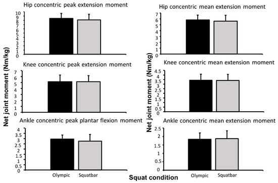 Net joint moments in the Olympic vs. Squatbar barbell.
