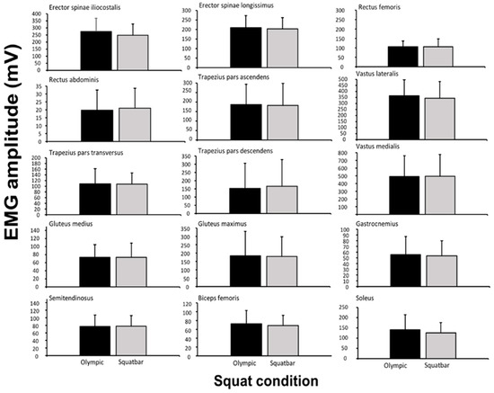 Mean (SD) EMG amplitude during the concentric phase for Olympic vs. Squatbar barbell (RMS).