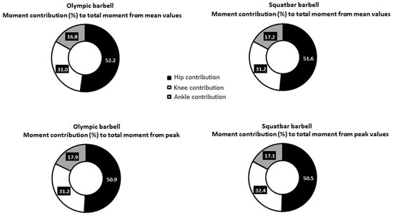 Percentage (%) mean and peak moment contribution for each joint to total moment.