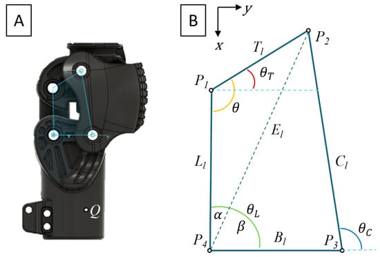 The calculations assume the back link (L) to be fixed and the length of the T (2.5 cm), C (5 cm), B (3 cm), and L (3.6 cm) to be constant. The origin of the coordinate system was assigned to node P1, and the B link was parallel to the positive x-axis. All three output angles are calculated in reference to the positive x-axis. The link E was the distance between P1 and P3, and α and β were the subdivisions of θL caused by this line. Figure 1 illustrates the knee’s four-bar system, its links, nodes, and angles relevant to initial position problem equations. Note that the subscript “l” denotes the length of that linkage. θT0 describes the initial angle of θT when at rest and is equal to 0.18π for this linkage.