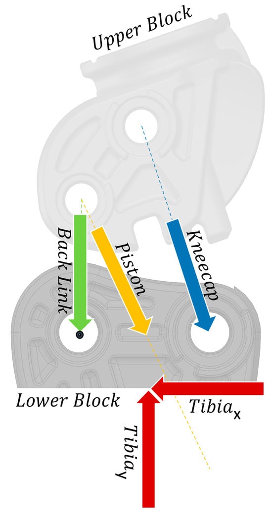 The first step in analyzing the forces acting on the various linkages was establishing the free body diagram (FBD) and defining the various components in effect. Figure 2 shows the basic configuration of the forces. The analysis of the system was undertaken during static locking; therefore, the forces acting on the system from gait were two-dimensional vectors that were translated to the tibia from the GRFs. The tibia angle was used to translate the vertical GRF into a tibia vector. For this study, the analysis focused primarily on the force vector acting on the piston, which attached to the lower block on a rotating axle lower than shown. This was undertaken to appropriately select hydraulic components that could withstand gait. The lower block was fixed, and its posterior axle, denoted by a black dot in the figure below, was the point from which the forces were considered. The forces acting through the back link, piston, and kneecap are uniaxial because they are attached to rotating axles.