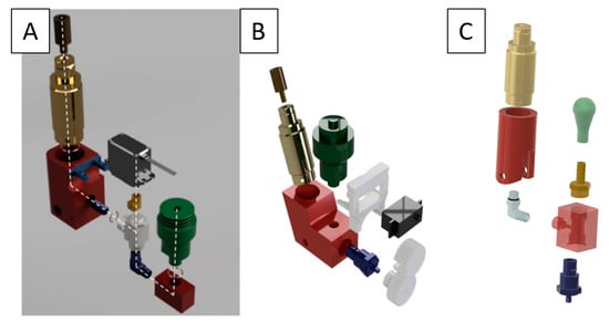 (A) First iteration hydraulic system with ball valve; (B) second iteration system with rotary valve; (C) third iteration system with optimized configuration and molded bladder.