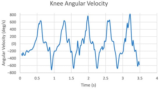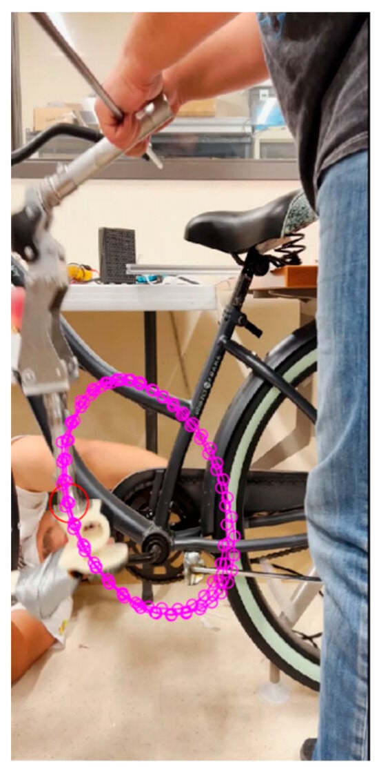 By attaching the foot of an assembled system to a bike pedal, the knee could be cycled to simulate a 100 steps/min cadence, which corresponds to an approximately 1.1 m/s gait speed falling within the norms of the literature cadence [,,]. Though this task does not perfectly simulate human gait, the primary objective was to evaluate angular velocity capabilities in a cyclic environment. This was conducted for three minutes, and a video recording was processed with MATLAB dltdv8 software for dot tracking, which was then extrapolated into angular velocity tests. A sample of this data collection process is shown in Figure 8 below.