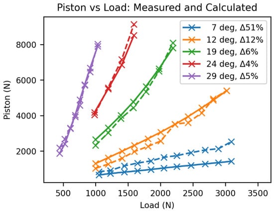 Figure 10 highlights both the validation of the mathematical model and a summary of the forces acting on the piston at various loads and angles. Note that angle 39 has been excluded from the figure below. Angles 29 and 39 began at 300 N and increased in 100 N steps until the limits had been reached because the normal 1000 N starting load already exceeded the measurement limitations. Despite this, angle 39 was at such extreme flexion that the test only had two data points and was therefore excluded.