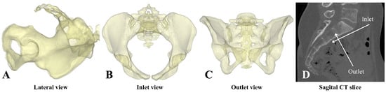 Three orientations of the pelvis in which fluoroscopy images are made during sacroiliac joint fusion (SIJF). During the procedure, the patient is placed in a prone position, and images are made in the lateral (A), inlet (B), and outlet (C) views. A central sagittal plane (D) is shown in which the directions of the inlet and outlet view are displayed.