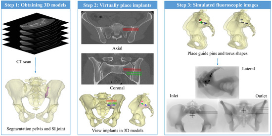 The method for VSP includes three main steps (Figure 2). First, the 3D models of the pelvis and the SI joint were segmented based on preoperative CT imaging. Second, the implants were virtually placed inside the CT data. Third, simulated fluoroscopic images of the VSP were constructed to mimic the intraoperative fluoroscopic imaging.