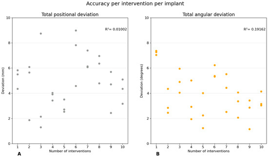 In this figure, the accuracy per intervention per implant is shown. During each intervention three implants were placed, comprising thirty implants per graph. (A) shows the total position deviations, and (B) shows the total angular deviations. The colors match the colors of the variables in Figure 4 and Figure 5. The coefficients of determination were calculated; these are and for the total positional deviation and the total angular deviation, respectively.