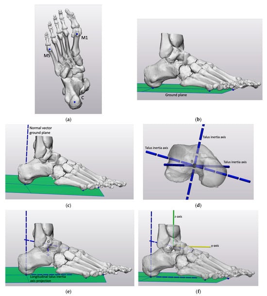 The construction of CS2: (a) Posterior–anterior view of the foot with the three automatically selected weight-bearing points: the most caudal point of the first metatarsal–sesamoid complex (M1), fifth metatarsal (M5), and calcaneus (C) in the original CT scan orientation. (b) Illustration of the foot with the ground plane based on the three weight-bearing points. (c) Illustration of the foot with the normal vector of the ground plane defining the direction of the z-axis. (d) Illustration of the inertia axes of the talus with its intersection point serving as the Origin (O). (e) Illustration of the foot with the projection of the longitudinal talus inertia axis on the ground plane, defining the direction of the y-axis. (f) Illustration of the foot with the normal vector and projected longitudinal talus inertia axis translated towards the Origin to form the z-axis and y-axis.