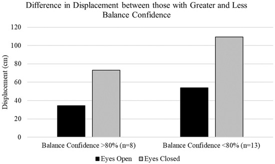 Those who had lower displacement were more likely to have greater confidence in their balance during both eyes open and eyes closed trials, p < 0.05.