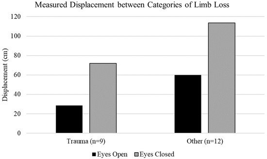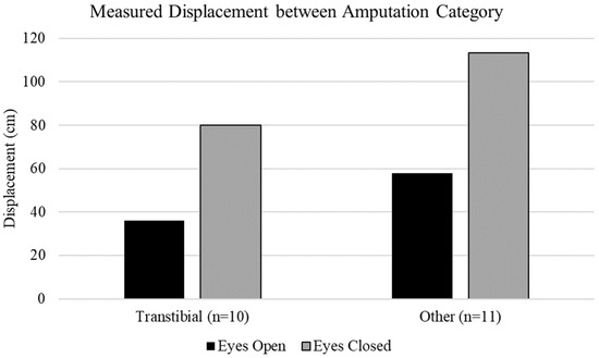During EOD testing, those with unilateral amputation displaced 21.8 cm less than those with other (transfemoral/multiple limb amputation), and 33.1 cm less during ECD testing, neither of which were significant, p > 0.05.