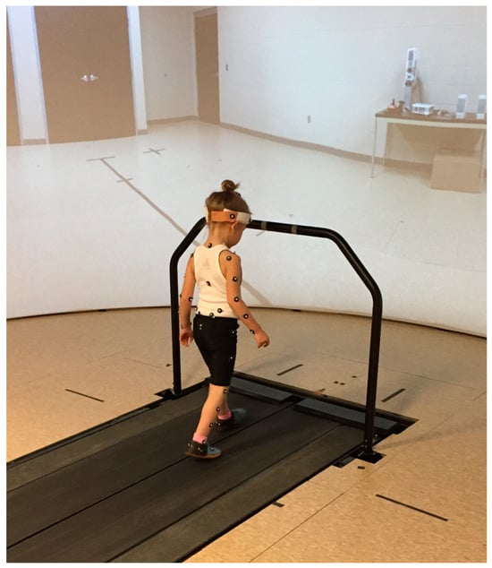 Example of child subject walking on the split-belt treadmill. The image depicts a full marker set; however, for this study, only the heel and toe markers on each foot were used to quantify the stride length and stride time for each subject.
