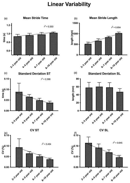 There was a significant effect of age group on CV stride time after controlling for both leg length and gait speed (F (3,22) = 5.58, p = 0.003, ηp2 = 0.493) (Table 2). The planned contrasts revealed that the 2–3-year-old group had significantly greater CV stride time compared to the other three groups (p < 0.05). There was a significant effect of age group on CV stride length after controlling for both leg length and gait speed (F (3,22) = 11.07, p < 0.001, ηp2 = 0.658). The planned contrasts revealed that CV stride length significantly decreased as the groups got older (p < 0.05). Specifically, the 2–3-year-old group had the largest CV stride time, which was significantly greater than the 4–5-year-old, 6–7-year-old, and 8–10-year-old groups (p < 0.05). The 4–5-year-old group also had significantly greater CV stride length than the 6–7-year-old and the 8–10-year-old groups (p < 0.05). The 6–7-year-old group also had significantly greater CV stride length compared to the 8–10-year-old group (p < 0.05). A regression analysis showed that there was in fact a very strong significant linear relationship (r = 0.867, p < 0.001), with CV stride length decreasing as children aged. There was a strong significant linear relationship between age and CV stride time (r = 0.689, p < 0.05), as well as a very strong relationship between age and CV stride length (r = 0.811, p < 0.05).