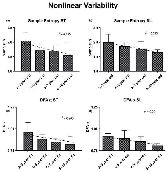 Group means for linear (SD, CV) and nonlinear (SE, DFA α) variability-dependent measurements for the 2–3-, 4–5-, 6–7-, and 8–10-year-old groups.