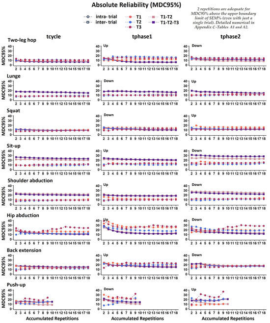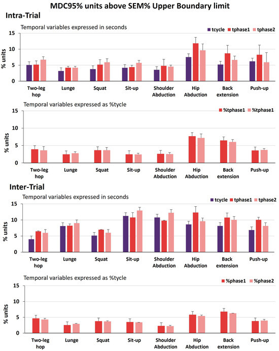 MDC95%. Figure 4 presents the intra- and inter-trial MDC95% indices concerning the temporal absolute reliability of the movement durations expressed in seconds (tcycle, tphase1, and tphase2). The MDC95% had an average of 13.7% (range: 6.4-39%) for the intra-trial observed values and an average of 15.9% (range: 5.4-31%) for the inter-trial values. Overall, consistently across all the exercises, the intra- and inter-trial MDC95% was well above the upper boundary limit of the SEM% (Figure 5). Detailed MDC95% numerical results for tcycle, tphase1, and tphase2 are provided in Appendix C—Table A1 on the intra-trial reliability and in Appendix C—Table A2 on the inter-trial reliability.