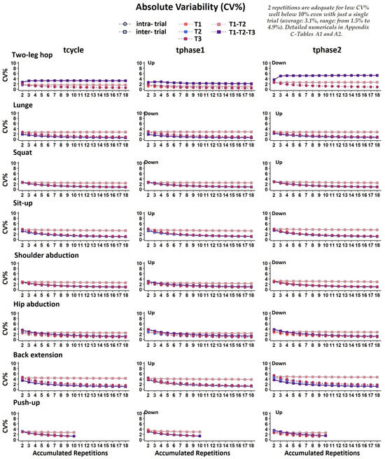 CV%. Figure 6 presents the intra- and inter-trial CV% concerning the movement durations expressed in seconds (tcycle, tphase1, and tphase2). Overall, consistently across the exercises (Figure 5), the low CV% values indicate that two repetitions were adequate for excellent absolute temporal reliability (averaged at 1.3% and 2.2%, for the intra- and the inter-trial CV%, respectively) (Appendix C—Table A1 and Table A2).