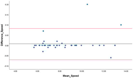Bland–Altman plots of test–retest for speed. Black line: Mean difference between test and retest scores. Red lines: 95% limits of agreement (upper and lower limits).