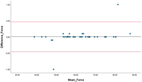 Bland–Altman plots of test–retest for force. Black line: Mean difference between test and retest scores. Red lines: 95% limits of agreement (upper and lower limits).