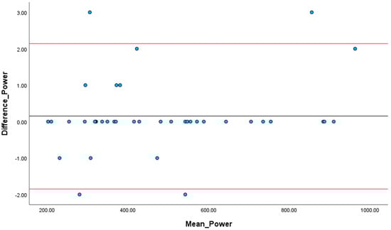 Bland–Altman plots of test–retest for power. Black line: Mean difference between test and retest scores. Red lines: 95% limits of agreement (upper and lower limits).
