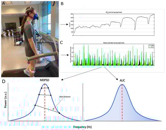 Picture (A) shows a participant performing the exercise protocol. Plots (B,C) provide samples of the metabolic data and EMG data that were collected during the exercise protocol. In plot (D), the left panel shows the distances between data points before and after the peak value. The peak value is indicated through a red vertical dashed line. The maximal distance between data points before and after peak values was used as an MDPSD measure. The MDPSD was used for further analysis. The right panel shows the AUC estimated from the PSD curve. The blue highlighted region in the PSD is the area that was used for correlation analysis.
