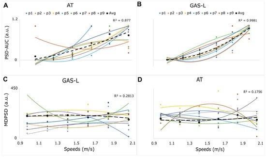Plots (A,B) show each participant’s PSD-AUC curvilinear trend for both the AT and GAS-L. The x-axis displays the average speed levels across participants in m/s. The y-axis is the normalized AUC between zero and one. Plots (C,D) show a higher nonlinear trend for GAS-L and AT, respectively. The x-axis displays the average speed in m/s for all the participants and the y-axis displays MDPSD in arbitrary units. The trends for GAS-L and AT’s MDPSD are relatively more nonlinear compared to PSD-AUC across all participants. The black dashed line shows the average values of each speed level across participants.