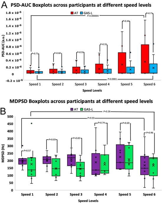 (A,B) present boxplots illustrating the PSD-AUC values and MDPSD values of both the AT and GAS-L muscles. The x-axis represents different speed levels ranging from 0.98 to 2.06 m/s, while the y-axis depicts the PSD-AUC values in arbitrary units and MDPSD values in Hz. The p-value resulting from the independent t-test conducted between the two muscles is displayed atop each speed level’s boxplot, connected by lines. Furthermore, interconnected lines also indicate the t-test p-values between the slowest and fastest speed levels. In the boxplots for AT and GAS-L, a cross symbol is employed to denote the average value for each speed level, calculated across all participants.