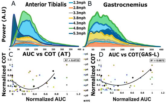 The relationship between PSD-AUC (shown in Figure 5A,B) and COT was tested in response to the observation of more linearity in the PSD-AUC trend than MDPSD as the participants started transitioning to faster walking. A second-order polynomial fit the data points well, with an R2 = 0.67 ± 0.27 for AT and R2 = 0.68 ± 0.18 for GAS-L. These findings indicated that the lowest COT did not relate to low and high PSD-AUC values, as demonstrated in Figure 5C,D. Additionally, once the lowest COT value was achieved, the PSD-AUC tended to increase linearly with higher COT values. Therefore, it is important to note that a lower or higher PSD-AUC does not necessarily correspond to the optimal COT value.